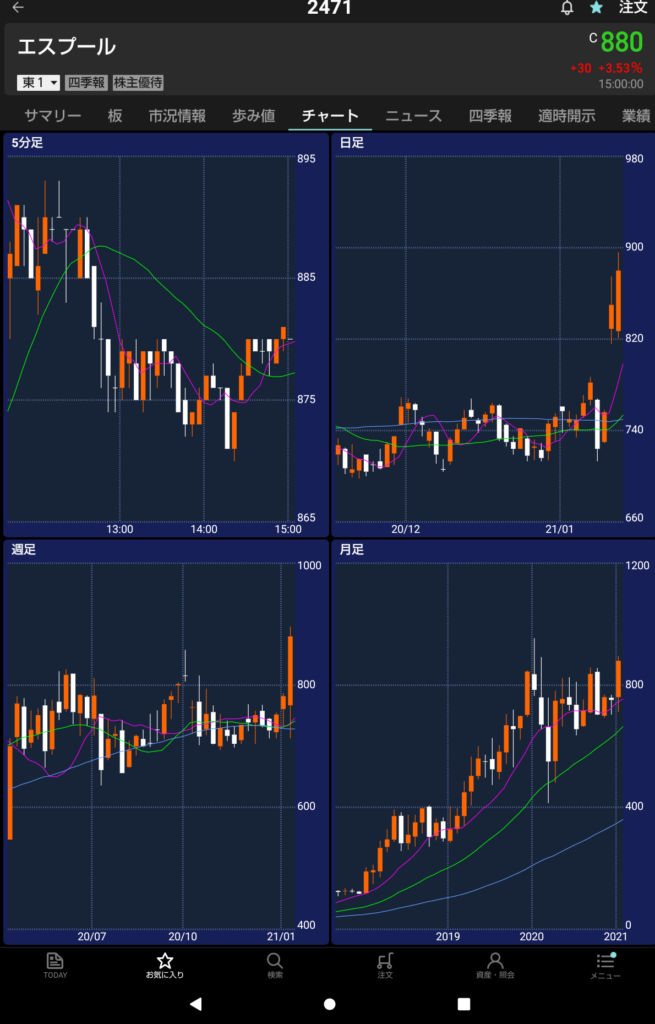 テクニカルの観点から考察する。1/16時点において日足でみると、完全に25日線を抜けている。週足で見ても始値、終値共に25日線を抜けている。月足で見ると、ここまで右肩上がり。したがって、このまま上昇トレンドが継続する可能性がある。