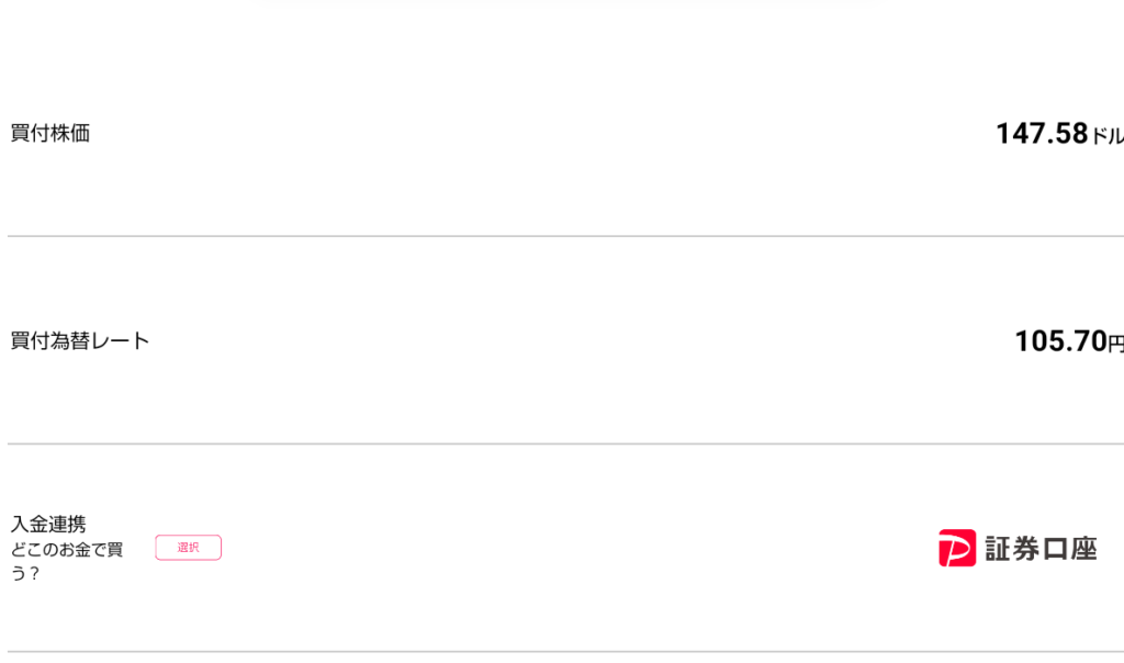次に為替レートは、米国株式を買う際に影響します。米国株式は米ドル建てで購入するため、1. PayPay証券で円を売って米ドルを買う 2. ドルを売って米国株式を買う という2段階の売買が生じます。このプロセス1で米ドルを買う際に手数料が生じます。具体的には米ドルあたり35銭を買付けの場合は加算、売付けの場合は減算したレートがそれぞれ適用されます。つまり、1米ドルを100円と仮定すれば片道0.35%かかります。米ドルが値上がりした場合も、0.3%程度はあるでしょう。