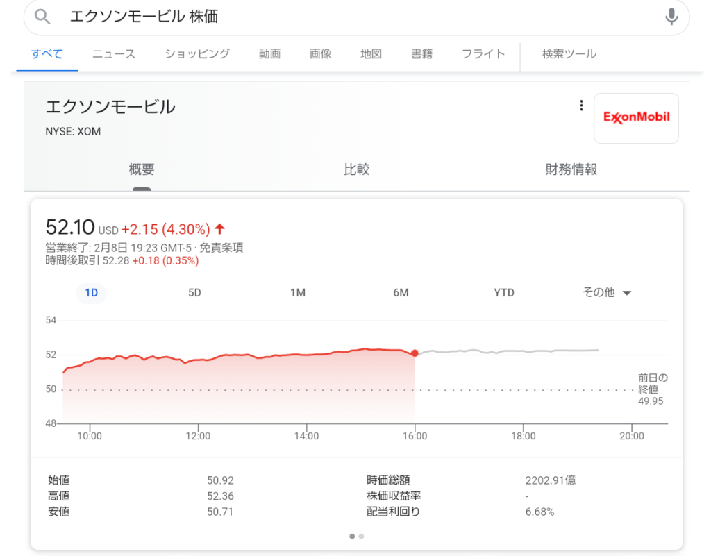 この画像は2021年2月9日にエクソンモービル社の株価をPayPay証券上の買い付け価格として見た場合と、グーグル検索で見た場合です(注1)。PayPay証券上では52.67米ドル、グーグル検索では52.10米ドルとなっています。グーグル検索の価格に比べてPayPay証券では1.094%高い価格が提示されています。この時間帯では米国株式のスプレッドが0.7%なので、基準価格は市場価格より0.394%高く設定されていることになります。つまり、少なくとも基準価格が市場の0.3%以上高く設定される場合があるようです。(おそらく他の銘柄を調べれば数字にばらつきがあるでしょう。)