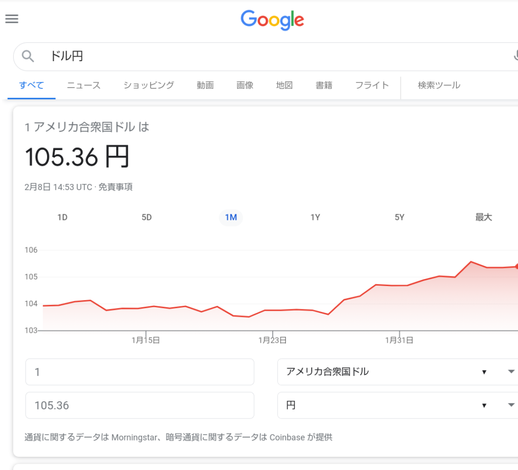 私が試しに確認した際は、下記の画像の通り、グーグルで1ドル105.36円の時にPaypay証券では1ドル105.70円で表示されました。